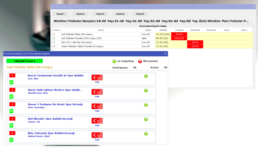 New module for checkin at Poomsae events. All competitors for a category will be inactive, unless they are checked in. On the court the operator can instantly see who is competing and who not.