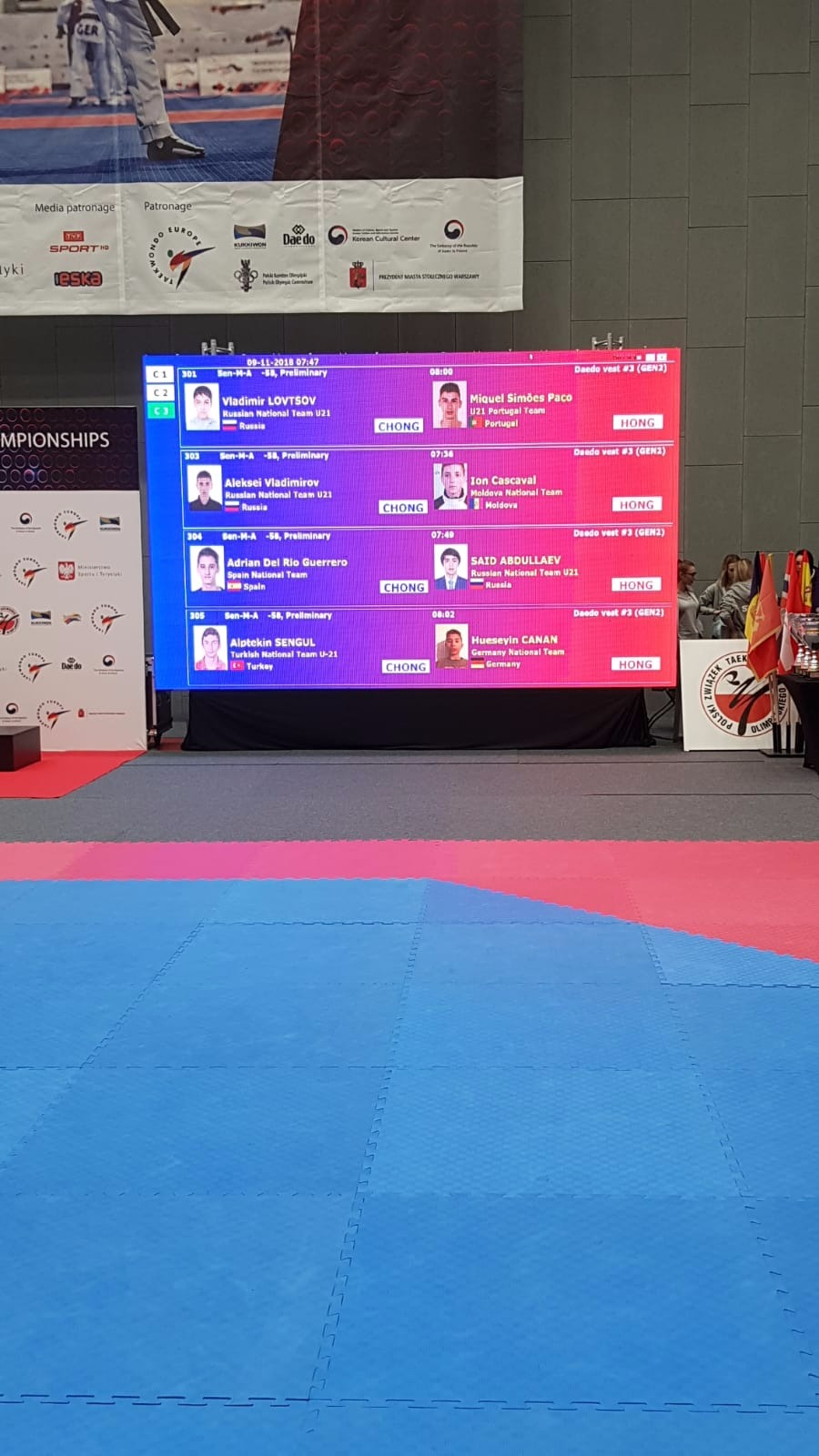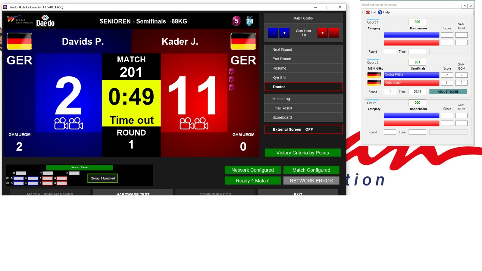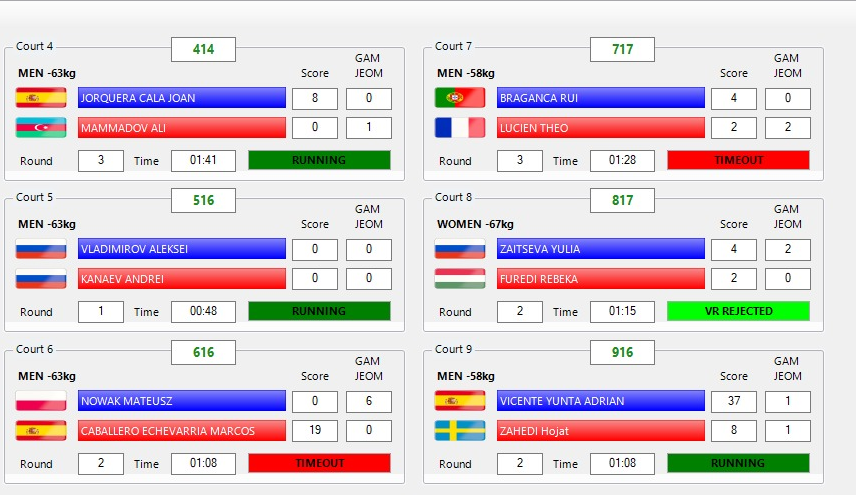 A display to show the current status of any fight on any court. Needs a connection with either daedo or KP&P scoreboard system and use of the WT protocol for communication.