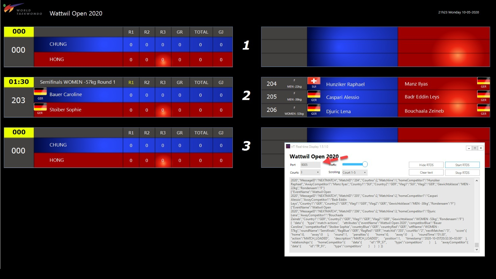Also embedded as module in TaekoPlan: the internal scoreboard monitor to see all the courts in a small popup. Also live status using the same connection as the RTDS.