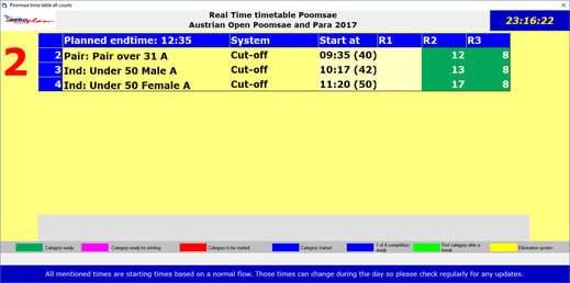 The poomsae beamer enables you to provide realtime information about the categories and the actual starting times during the day. it shows the progress of the categories, the next competitor to start and the updated time table.