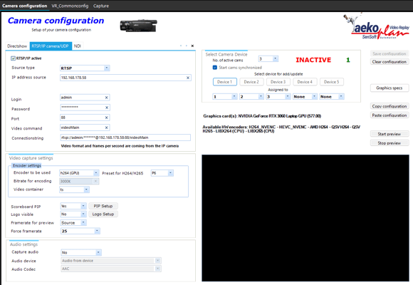 Directshow devices, IP camera's, NDI and Multiview can be used as input. Includes OBS streaming option as well as full sync between cams.
